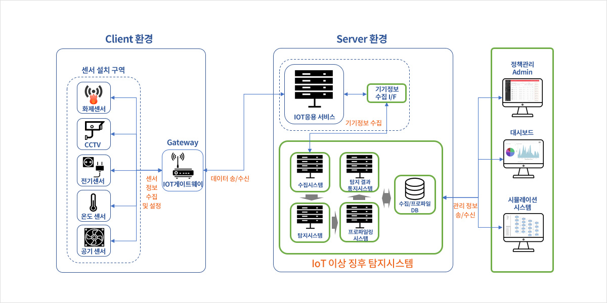 핵심 구성요소로는 사물인터넷 기기 데이터 수집, 기기별 프로파일링, 이상 징후 탐지, 탐지 정보 통지, 시뮬레이션 시스템 등으로 구성되어 있는 솔루션입니다.