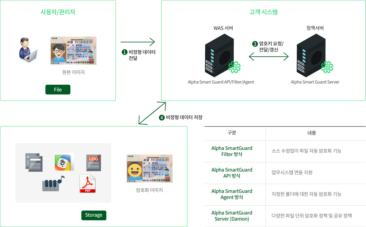 ·Alpha SmartGuard는 파일 및 이미지와 같은 비정형 데이터에 포함된 개인정보를 암호화 하여